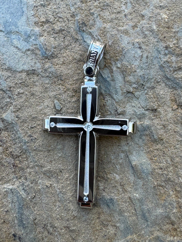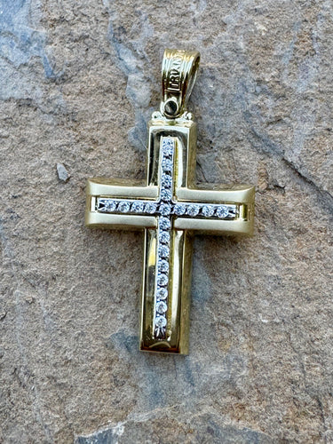 • Triantos 14k 2 Tone White and Yellow Gold Polished and Brushed Cross with Precious Stones 3.60g