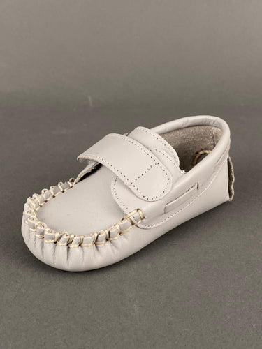 Grey Leather Moccasin Crib Shoe with Velcro StrapGrey Leather Moccasin Crib Shoe with Velcro Strap
