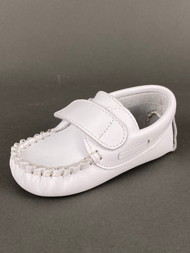 White Leather Moccasin Crib Shoe with Leather StrapWhite Leather Moccasin Crib Shoe with Leather Strap