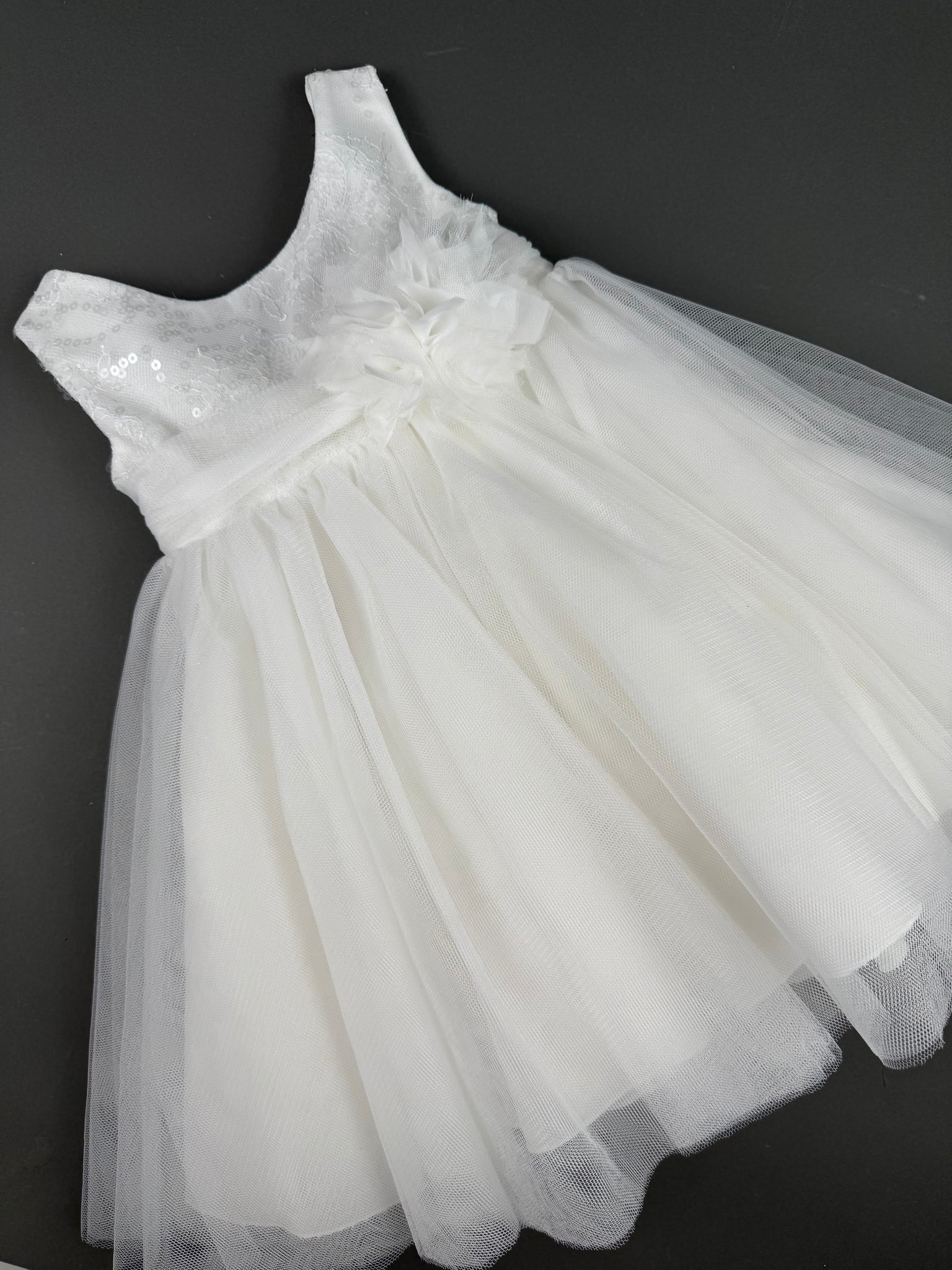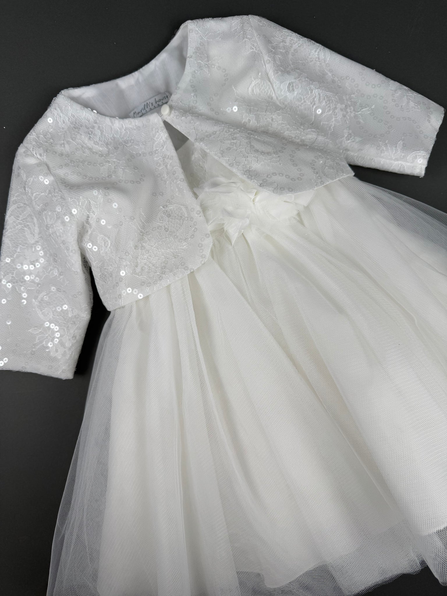 Dress 77 Girls Baptismal Christening Sleeveless Dress with Sequence French lace, matching Bolero and Hat. Made in Greece exclusively for Rosies Collections. 202577