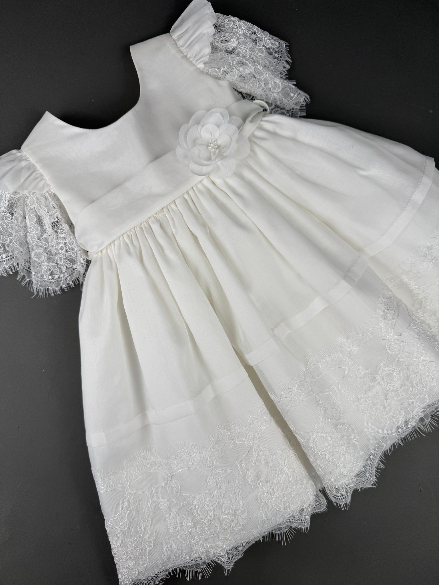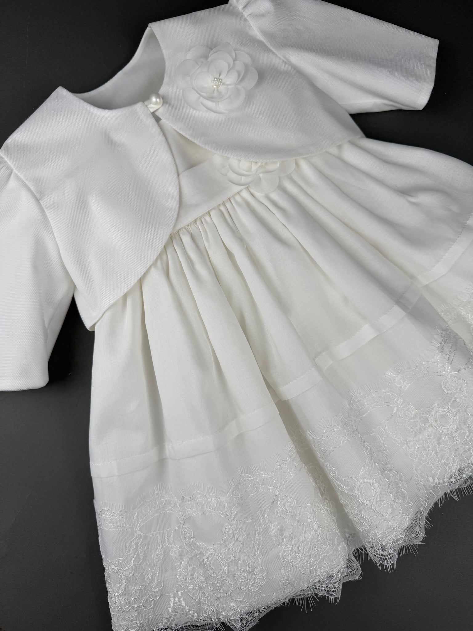 Dress 91 Girls Baptismal Christening French lace, Dress with matching Bolero and Hat. Made in Greece exclusively for Rosies Collections. 202591