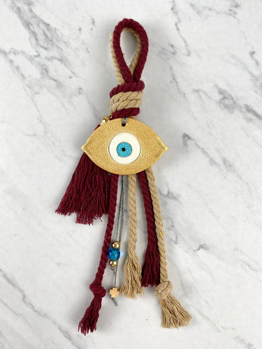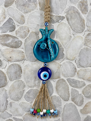 Turquoise Ceramic Pomegranate with Glass Evil Eye Mati and wooden beads Gouri SM11Turquoise Ceramic Pomegranate with Glass Evil Eye Mati and wooden beads Gouri SM11