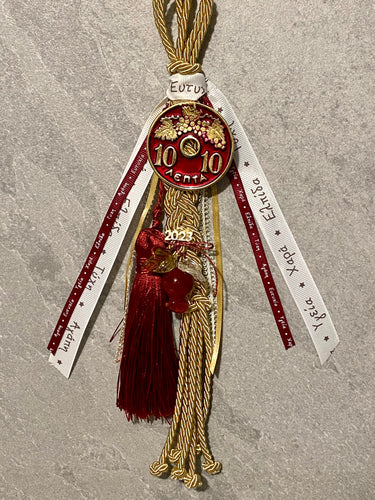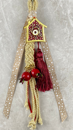 Greek Coin 10 Lepta Gouri with Greek Ribbons, Charms, Glass Pomegranate and Tassel G233435Greek Coin 10 Lepta Gouri with Greek Ribbons, Charms, Glass Pomegranate and Tassel G233435