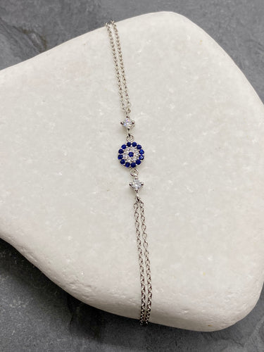925” Sterling Silver Evil Eye Mati with Rhinestones and double chain Bracelet SB19925” Sterling Silver Evil Eye Mati with Rhinestones and double chain Bracelet SB19
