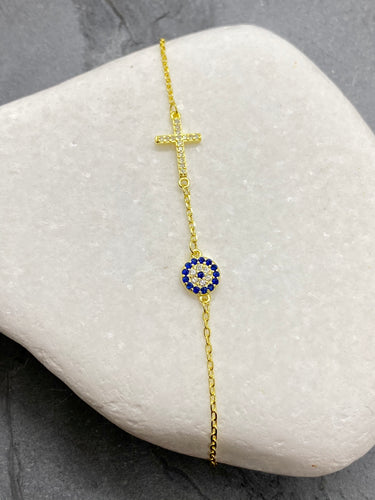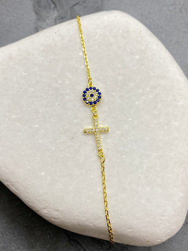 925” Sterling Gold Evil Eye Mati with Cross and Rhinestones Bracelet GB11925” Sterling Gold Evil Eye Mati with Cross and Rhinestones Bracelet GB11
